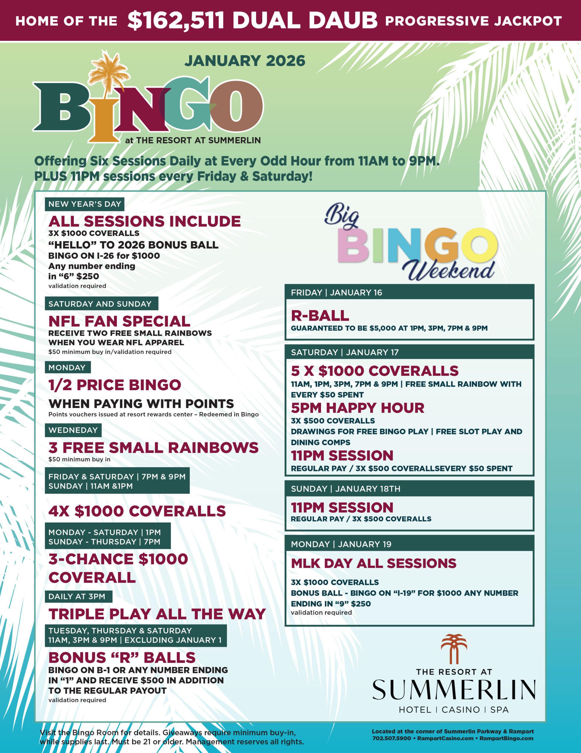 The Bingo Room opens daily at 10:00 am. Bingo sales begin 30 minutes before the start of each session. Rampart Rewards cardholders will earn rewards through Bingo play. Bingo play is cash only and players must be 21 years of age.