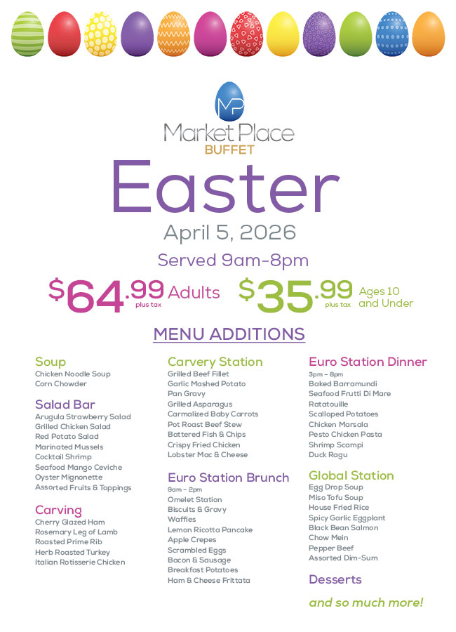 Enjoy a special Easter Menu at the Marketplace Buffet from 9am – 8pm.